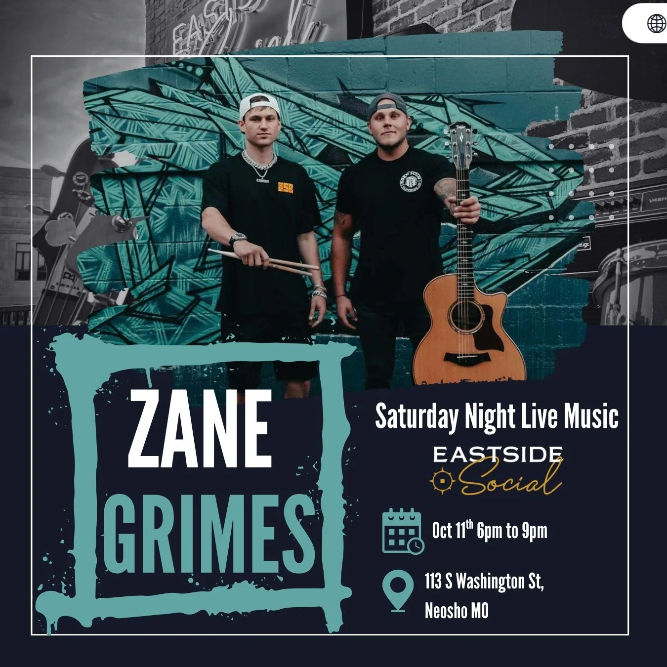 Back to All Events Zane Grimes Music Saturday, October 11, 2025 6:00 PM 9:00 PM Eastside Social 113 South Washington Street Neosho, MO, 64850 United States (map) Google Calendar ICS Zane Grimes is back to rock out at Eastside Social! Mark your calendars for October 11th because it’s going to be a night to remember. He’ll be jamming out from 6 PM to 9 PM! Don’t miss it!